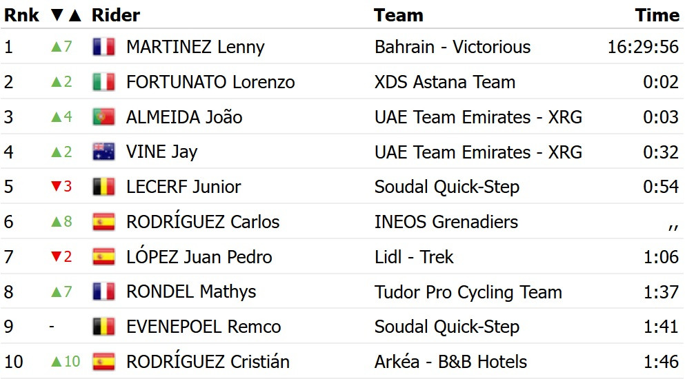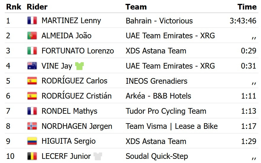 Мартинес в финишном спринте опередил португальца Жоау Алмейду из команды UAE Emirates. Топ-3 с отставанием в 29 секунд замкнул итальянец Лоренцо Фортунато из XDS Astana. Французу этот успех позволил перехватить лидерство в общем зачете многодневки.