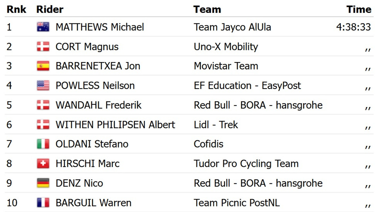 В финишном спринте из немногочисленного пелотона (суммарно в основной группе финиша добрались 24 гонщика) Мэттьюз опередил датчанина Магнуса Корта из команды UnoX и испанца Йона Барренечеа из Movistar. Для 34-летнего австралийца это первая победа в текущем сезоне.