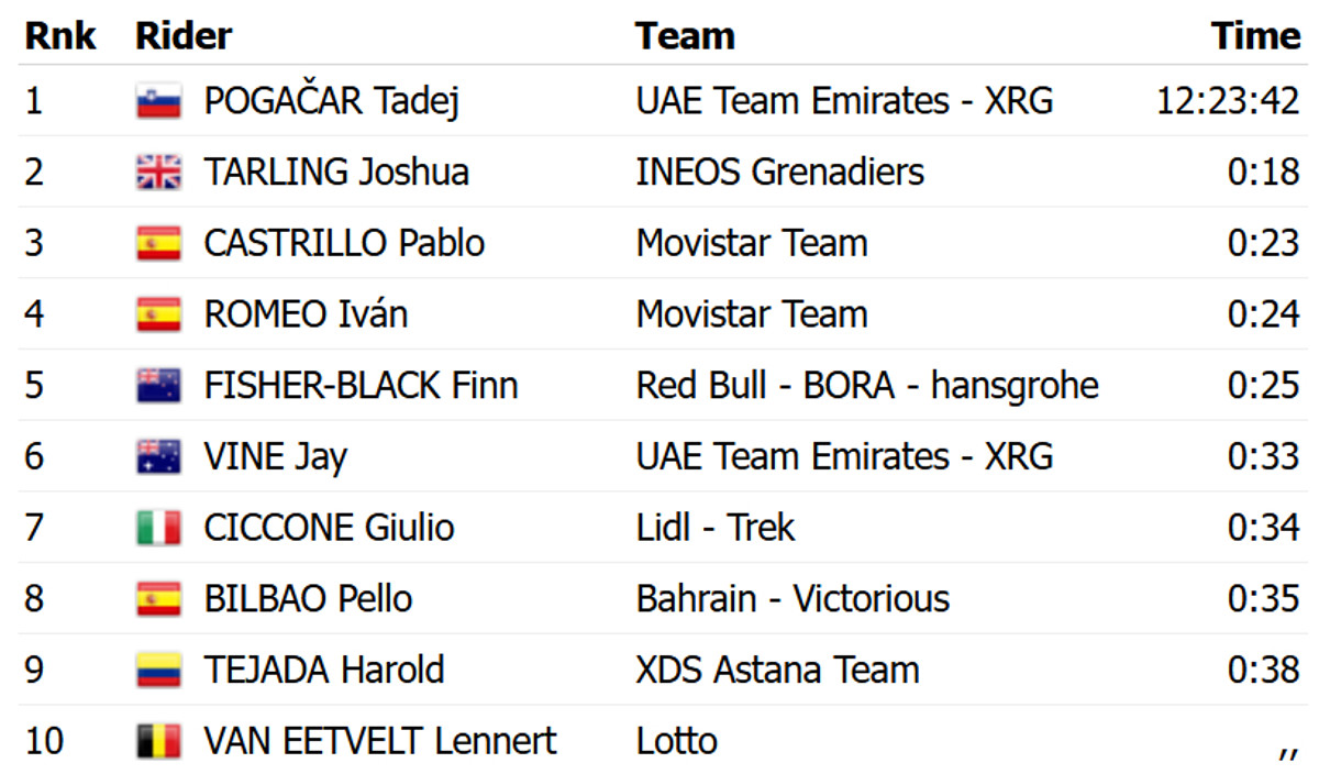 Лидерство в общем зачете сохранил словенец Тадей Погачар из команды UAE Emirates, который вчера выиграл третий этап.