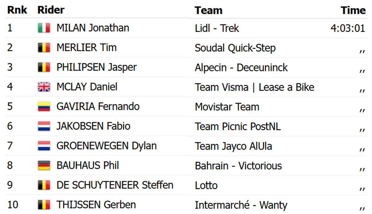 В нем Милан оказался самым быстрым и одержал свою вторую победу на нынешнем Туре ОАЭ. Итальянец опередил двух бельгийцев – Тима Мерлира из Soudal Quick Step и Яспера Филипсена из Alpecin Deceuninck.