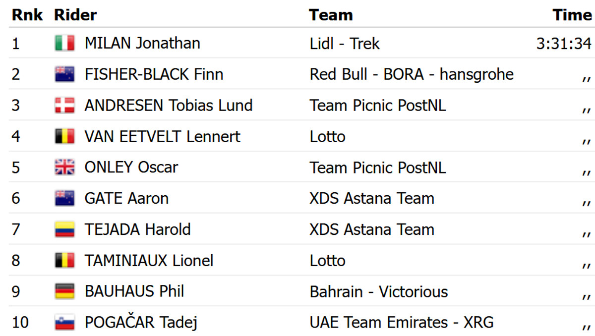Победу в финишном спринте из пелотона одержал Милан, который опередил австралийца Финна Фишера Блэка из Red Bull Bora и датчанина Тобиаса Лунда Андерсена из Picnic PostNL.