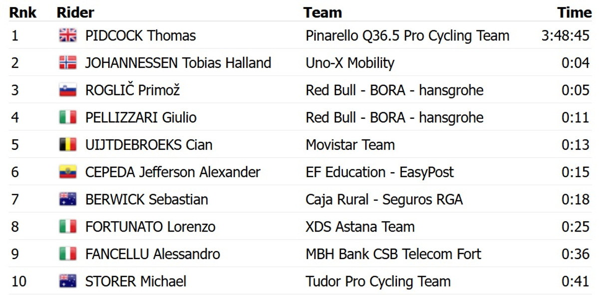 Благодаря атаке на последнем километре дистанции Пидкок на 4 секунды опередил норвежца Тобиаса Халланда Йоханнессена из UnoX. Топ-3 замкнул словенец Примож Роглич из Red Bull Bora.