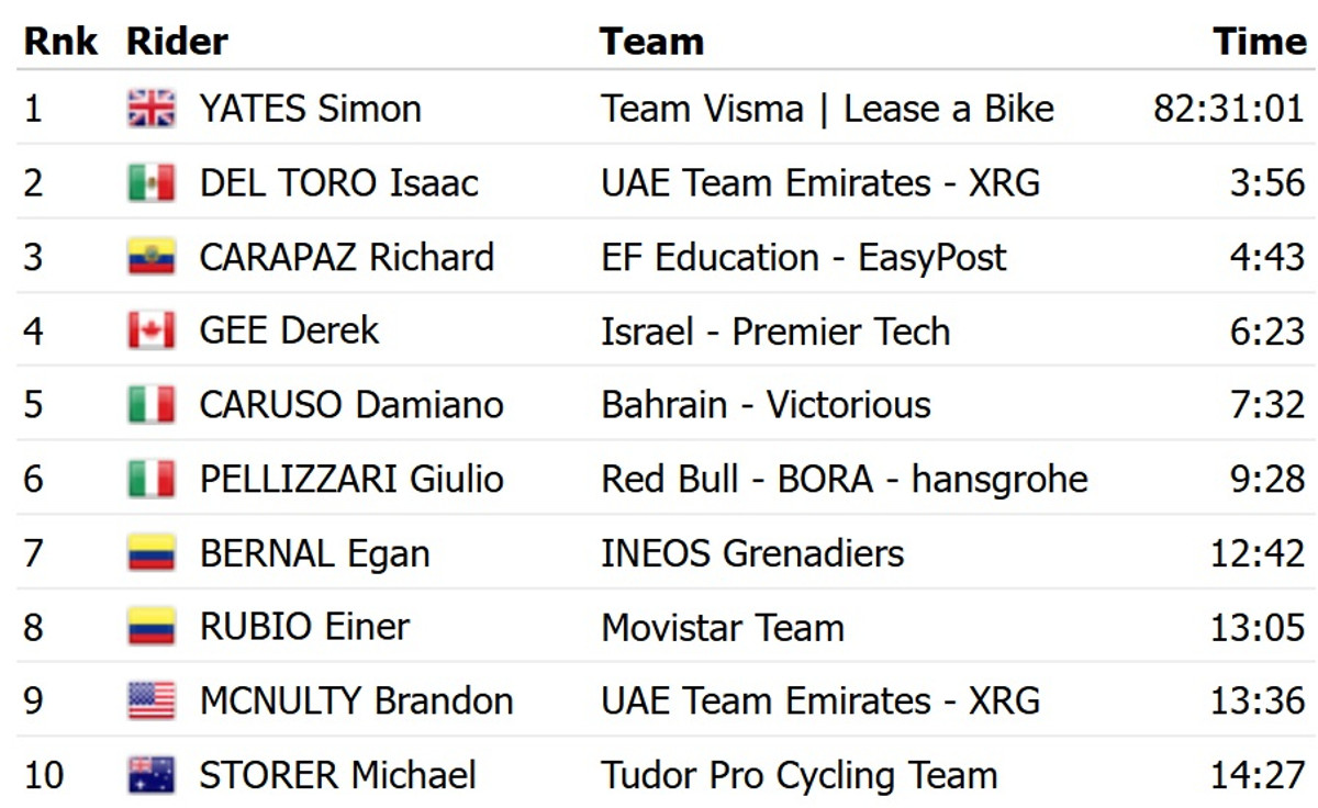 В итоговом общем зачете Йейтс опередил мексиканца Исаака Дель Торо из команды UAE Emirates и эквадорца Ричарда Карапаса из EF Education EasyPost.