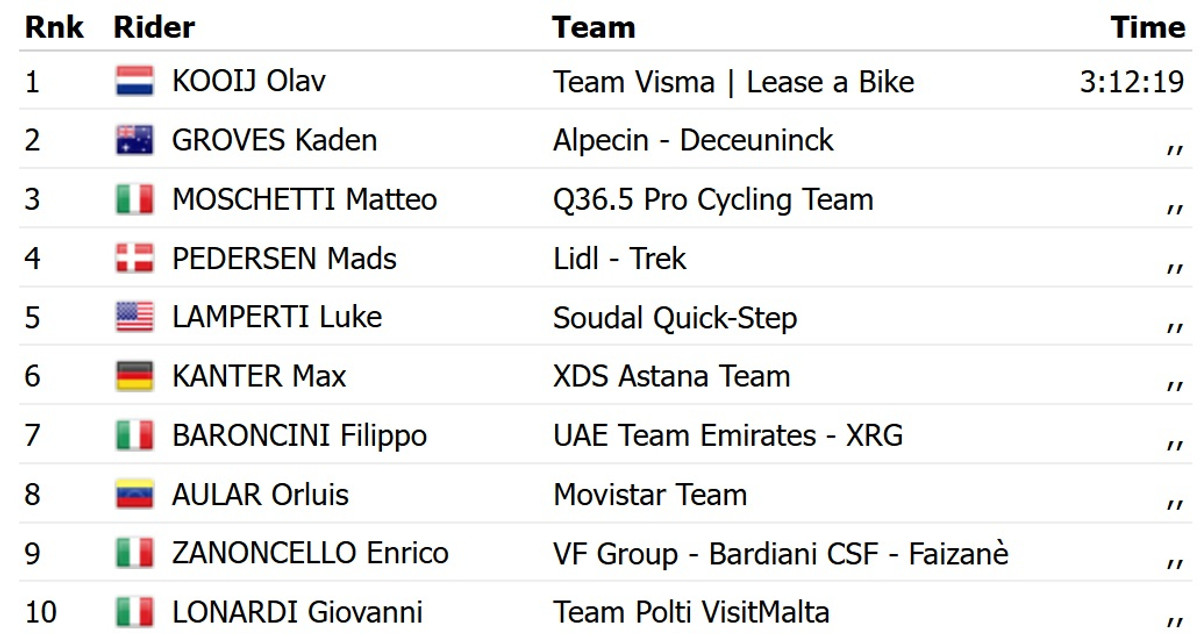 В заключительный день гонщики преодолели 145 км равнинной дистанции со стартом и финишем в Риме. Победителем финального этапа стал партнер Йейтса по Visma Lease a Bike, нидерландец Олав Коой. В финишном спринте он опередил австралийца Кейдена Гроувза из Alpecin Deceuninck и итальянца Маттео Москетти из Q36.5.