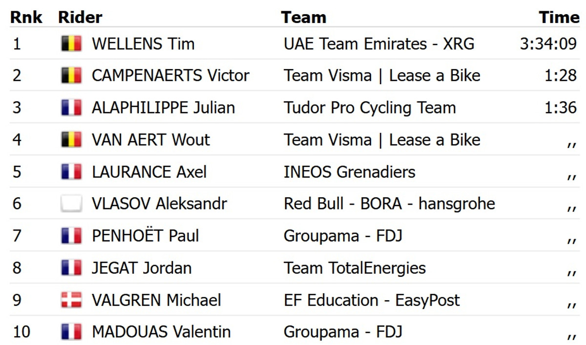 Благодаря сольной атаке за 43 км до финиша Велленс из отрыва на 1 минуту и 28 секунд опередил бельгийца Виктора Кампенартса из Visma Lease a Bike. Топ-3 замкнул француз Жулиан Алафилипп из команды Tudor Cycling.