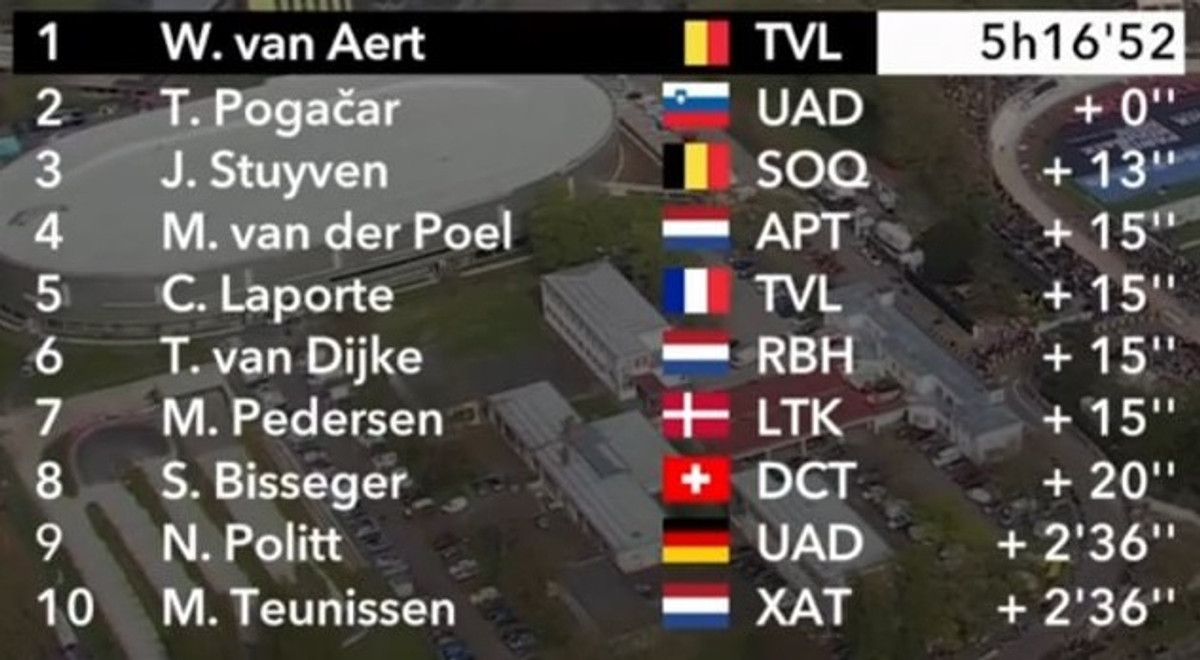 Главным соперником Ван Арта в борьбе за победу стал словенец Тадей Погачар, которого он опередил в финишном спринте. Топ-3 с отставанием в 13 секунд замкнул бельгиец Яспер Стуйвен из Soudal Quick Step.