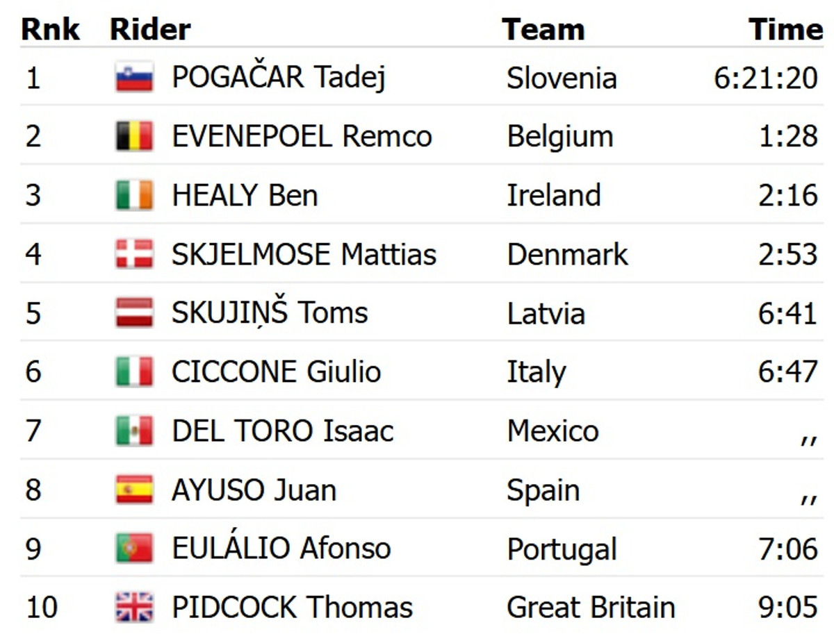 Решающей оказалась атака Погачара за 66 км до финиша. В итоге он на 1 минуту и 28 секунды опередил бельгийца Ремко Эвенепула. Бронзу завоевал ирландец Бен Хили, который проиграл Погачару 2 минуты и 16 секунд.