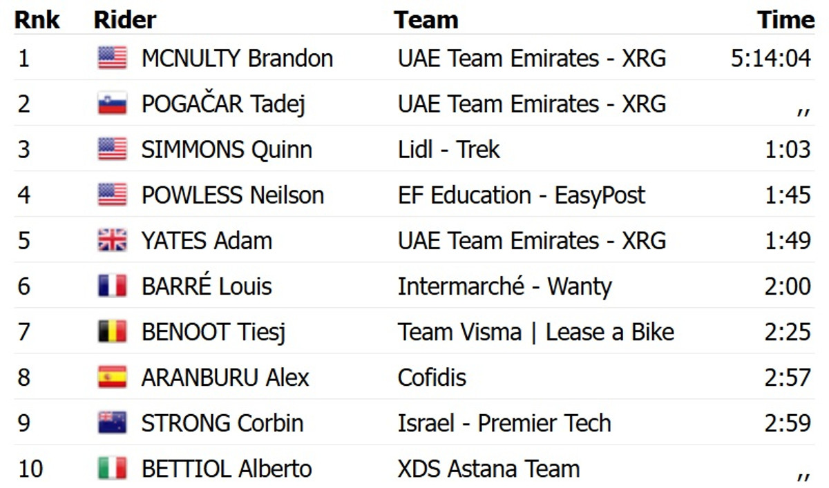 Об этом узнал Погачар. Словенец подождал партнера по команде, после чего они организовали парную работу, а на финише Тадей позволил победить партнеру по команде. Симмонс замкнул топ-3.