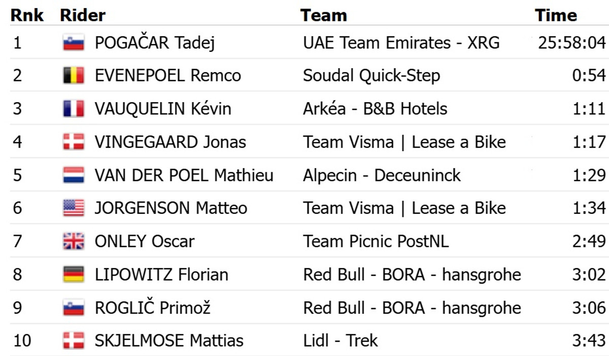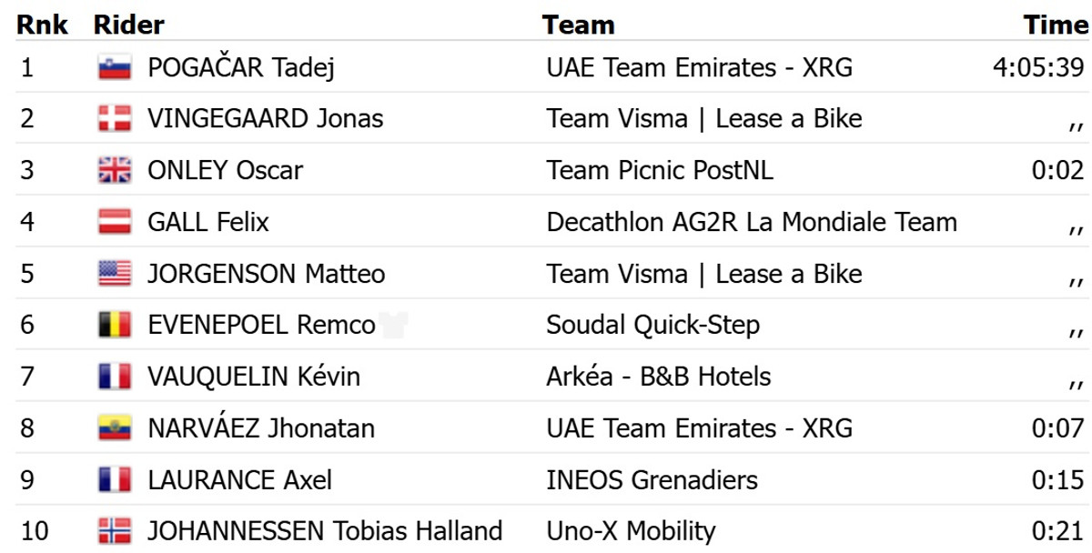 В финишном спринте Погачар опередил датчанина Йонаса Вингегора из команды Visma Lease a Bike. Топ-3 с отставанием в 2 секунды замкнул британец Оскар Онли из команды Picnic PostNL.
