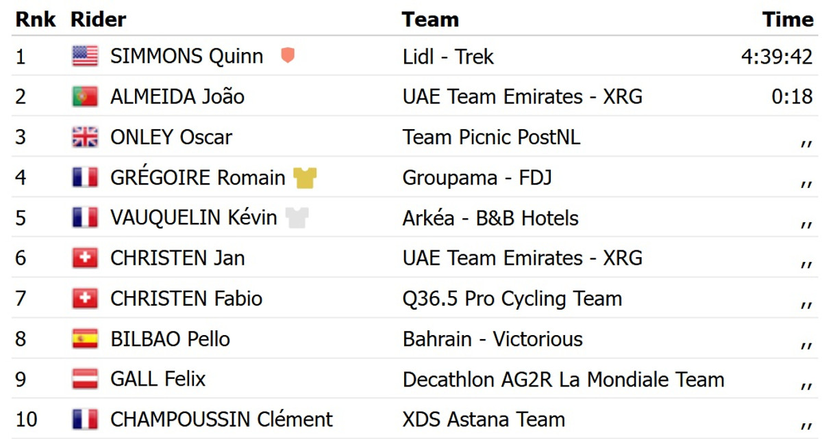 Победитель первого этапа, француз Ромен Грегуар из Groupama FDJ, финишировал четвертым и сохранил желтую майку лидера общего зачета.