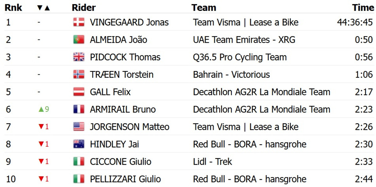 Красную майку лидера общего зачета сохранил на своих плечах датчанин Йонас Вингегор из Visma Lease a Bike. Француз Бруно Армирай прорвался на 6 место благодаря участию в отрыве дня.