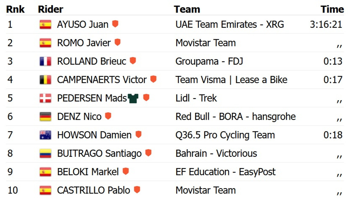 Аюсо в парном финишном спринте с отрыва дня опередил соотечественника Хавьера Ромо из Movistar. Топ-3 замкнул Бриюк Роллан из Groupama FDJ. Для Аюсо это вторая победа на текущей Вуэльте – ранее он выиграл 7 этап.