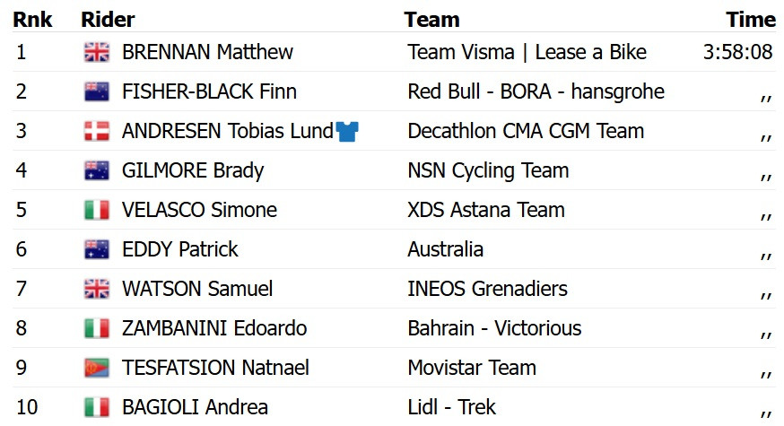 Победу на этапе одержал британец Мэттью Бреннан из команды Visma Lease a Bike. В финишном спринте он опередил австралийца Финна Фишера-Блэка из Red Bull Bora и датчанина Тобиаса Лунда Андресена из Decathlon CMA CGM.