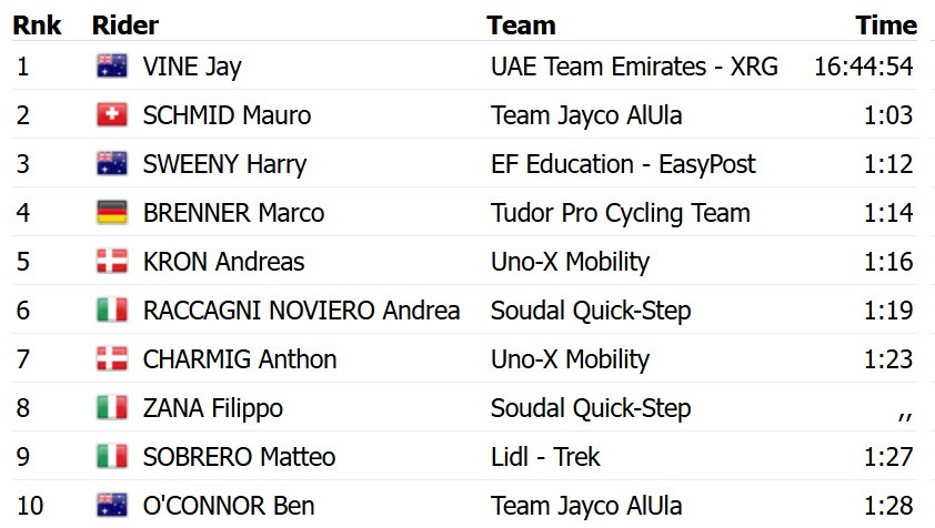 В итоговом общем зачете Вайн опередил швейцарца Мауро Шмида с Jayco AlUla и своего соотечественника Гарри Свини из EF Education EasyPost.