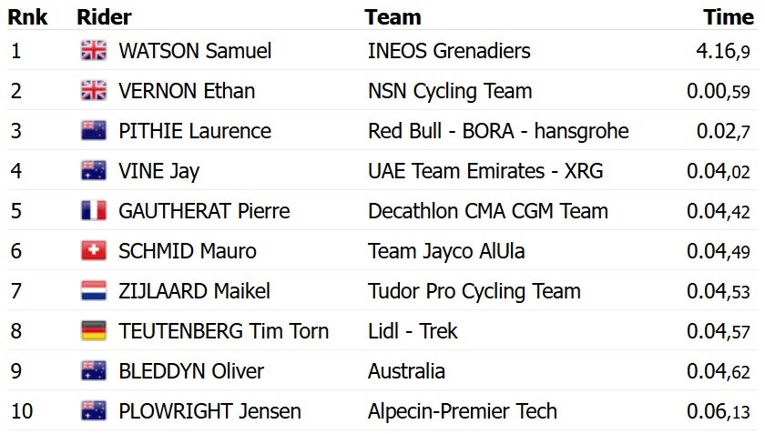 Победу одержал британец Сэмюэл Уотсон из команды Ineos Grenadiers. Он опередил своего соотечественника Итана Вернона из NSN и хозяина соревнований, австралийца Лоренса Пити из Red Bull Bora.