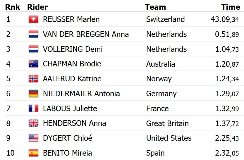 Убедительную победу одержала швейцарка Марлен Ройссер. Она на 51 секунду опередила нидерландку Анну Ван дер Брегген. Топ-3 замкнула еще одна представительница Нидерландов, Деми Воллеринг.