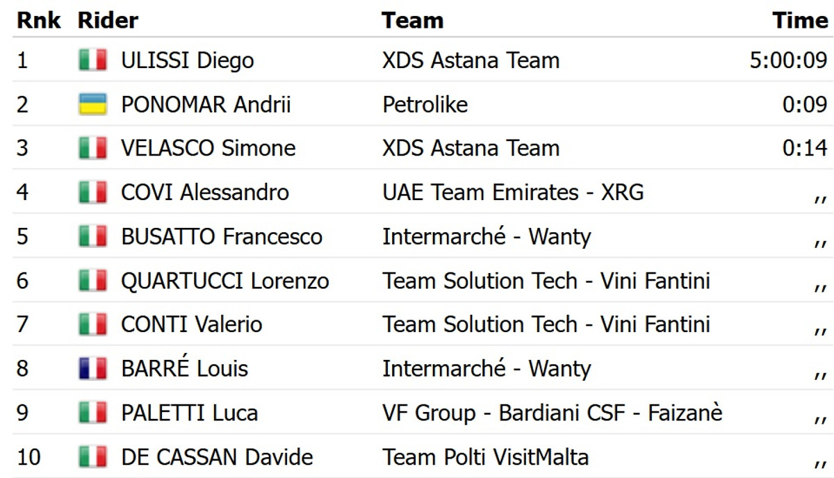 Пономарь финишировал вторым, проиграв 9 секунд именитому итальянскому гонщику команды XDS Astana Диего Улисси. Топ-3 с отставанием в 14 секунд замкнул еще один представитель XDS Astana, Симоне Веласко.