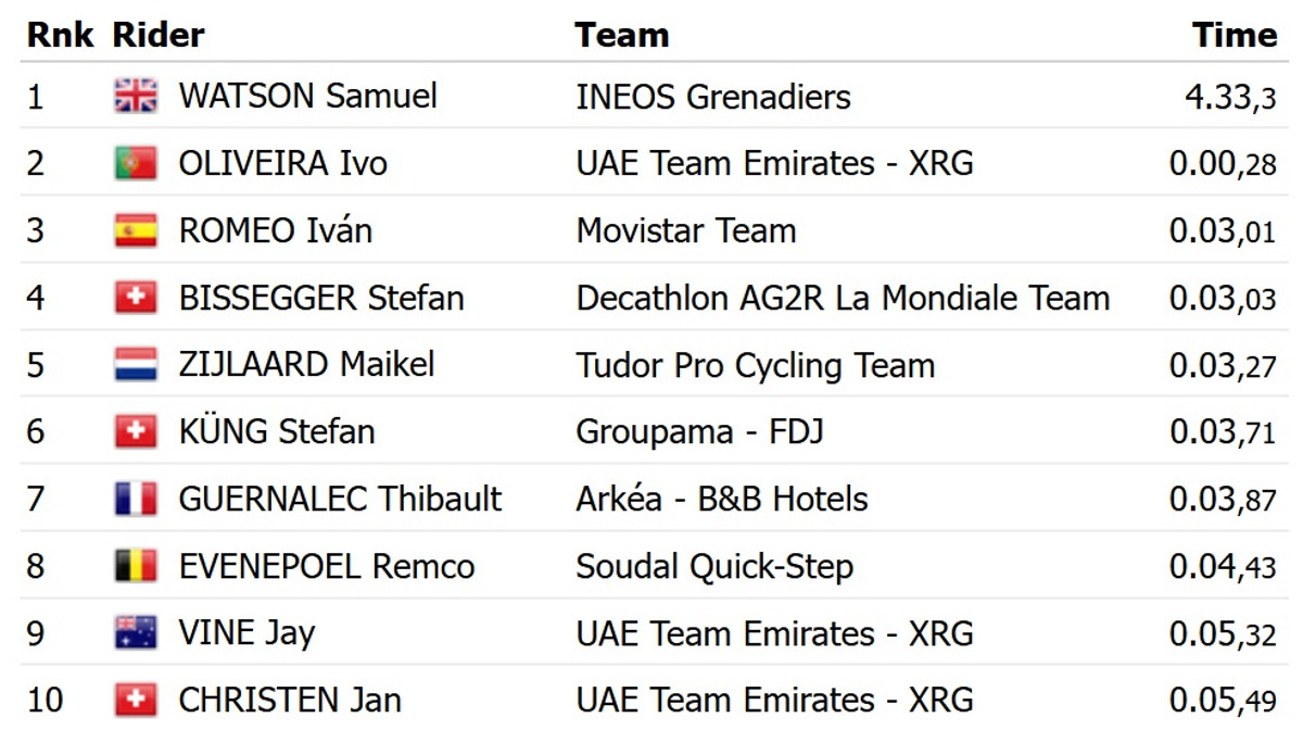 Уотсон всего на 0,28 секунды опередил португальца Иво Оливейру из команды UAE Emirates. Топ-3 замкнул испанец Иван Ромео из Movistar. Главный фаворит Тура Романдии, Ремко Эвенепул, показал восьмой результат с отставанием в 4 секунды.