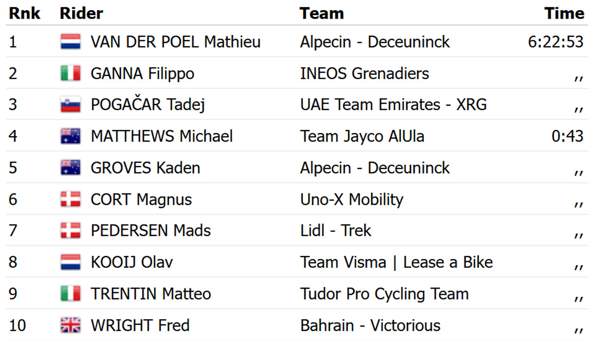 В финишном спринте он опередил итальянца Филиппо Ганну из Ineos Grenadiers. Третьим стал действующий чемпион мира в групповой гонке, словенец Тадей Погачар из команды UAE Emirates.