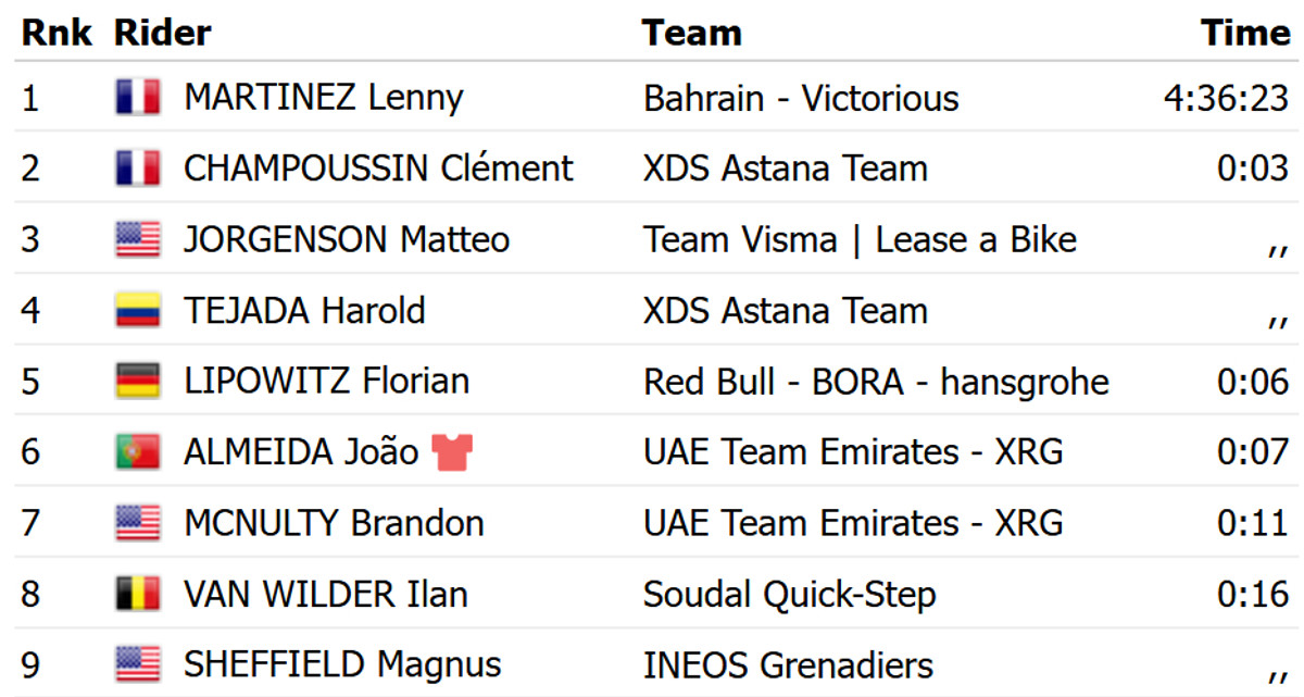 Мартинес на 3 секунды опередил своего соотечественника, Клемана Шампуссена из XDS Astana. Топ-3 замкнул действующий чемпион Париж – Ницца, американец Маттео Йоргенсон из Visma Lease a Bike.