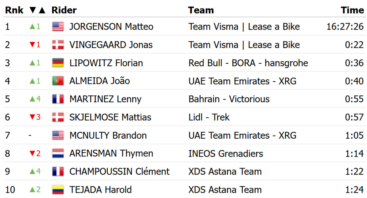 Это позволило ему перехватить желтую майку лидера общего зачета у своего партнера по команде, датчанина Йонаса Вингегора из Visma Lease a Bike, который финишировал 16-м с отставанием в 26 секунд. Отметим, что в середине этапа Вингегор потерпел падение.