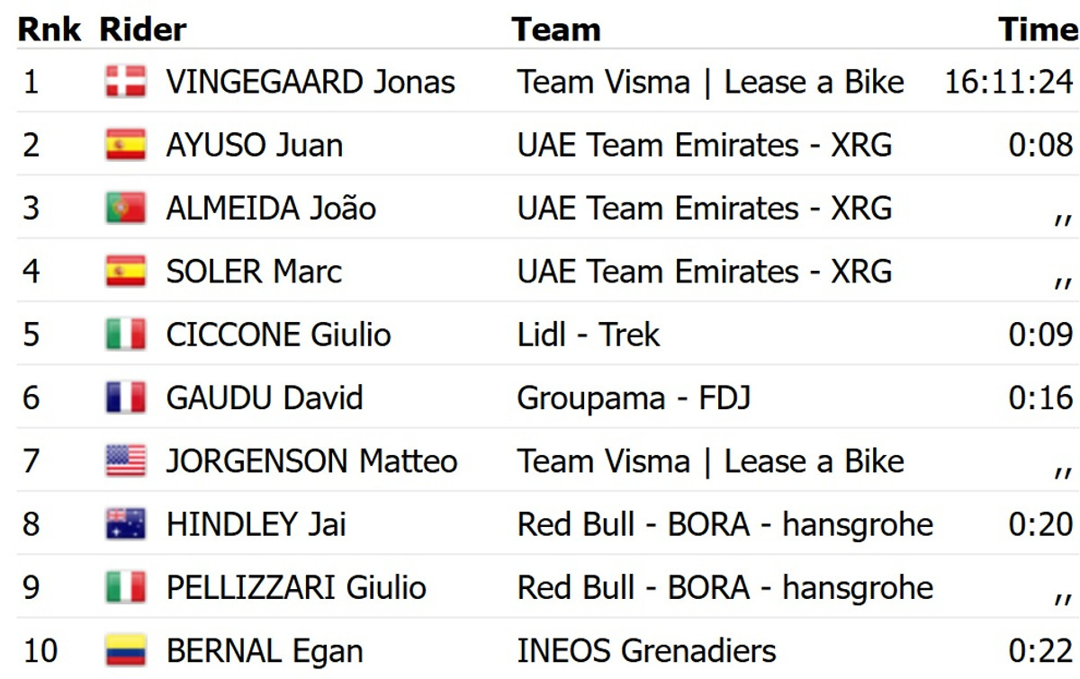 Красную майку лидера общего зачета вернул себе датчанин Йонас Вингегор из Visma Lease a Bike. Команда Давида Годю, Groupama FDJ, показала девятый результат с отставанием в 24 секунды.