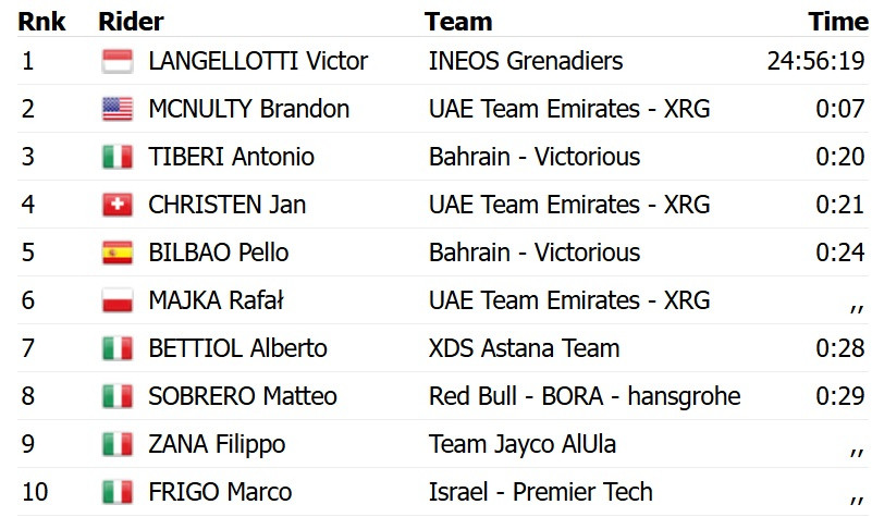 Ланжелотти благодаря впечатляющей атаке на последних сотнях метров дистанции обошел американца Брэндона МакНалти из команды UAE Emirates. Топ-3 замкнул испанец Пельо Бильбао из Bahrain Victorious, который проиграл 7 секунд.