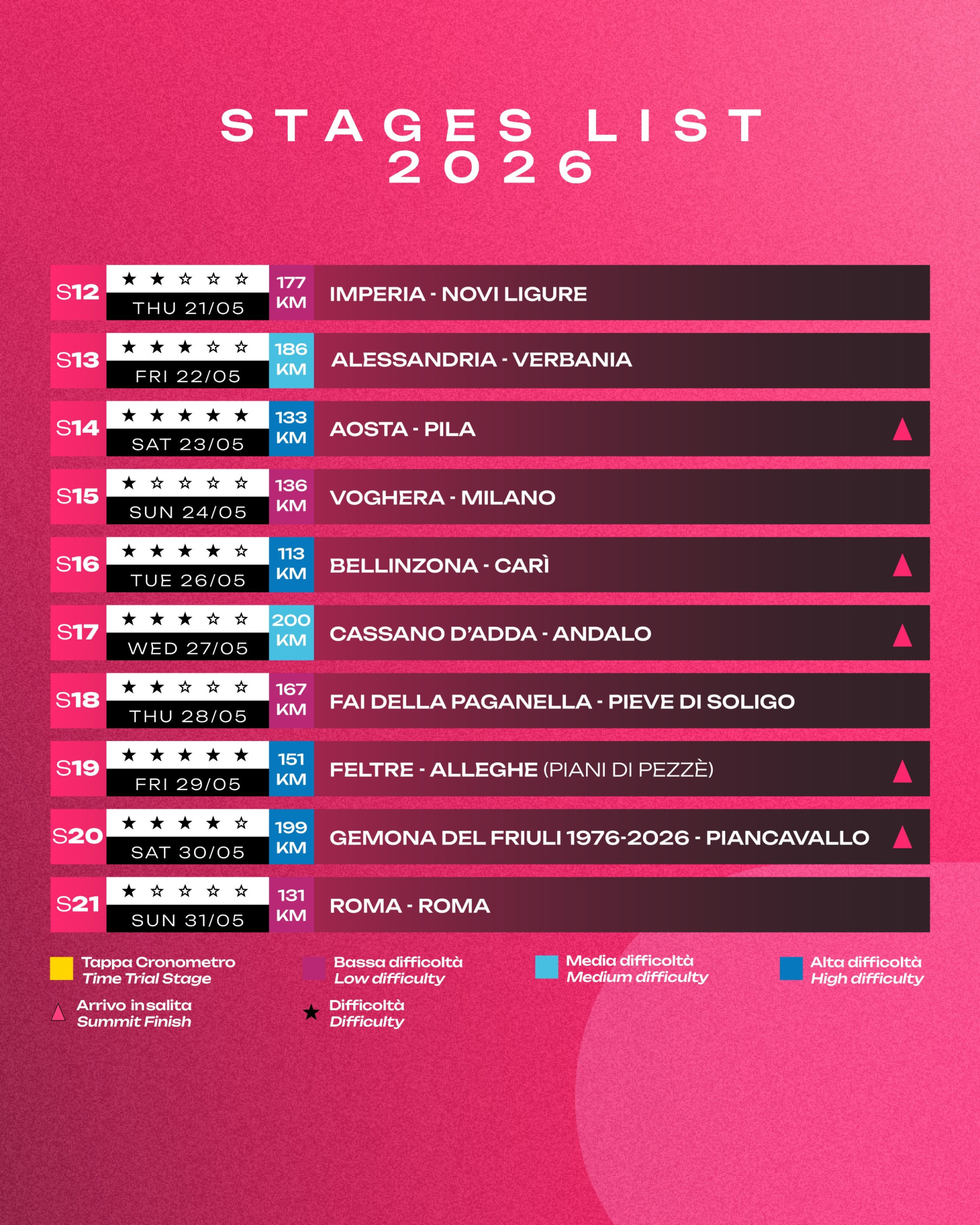 Джиро-2026 – это 21 этап суммарной дистанцией 3459,2 км и совокупным набором высоты в 49150 метров. 20 этапов будут групповыми, еще один – это индивидуальная разделка на 40,2 км на 10 этапе. Из 20 групповых этапов 8 будут спринтерскими, 7 – холмистыми и еще 5 – высокогорными.