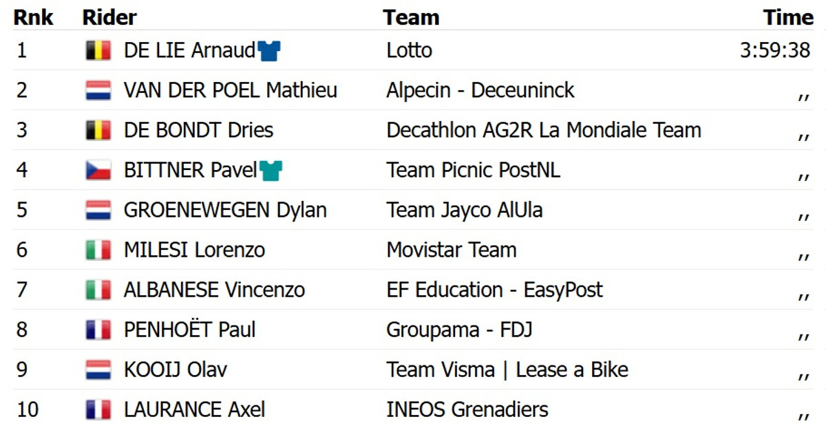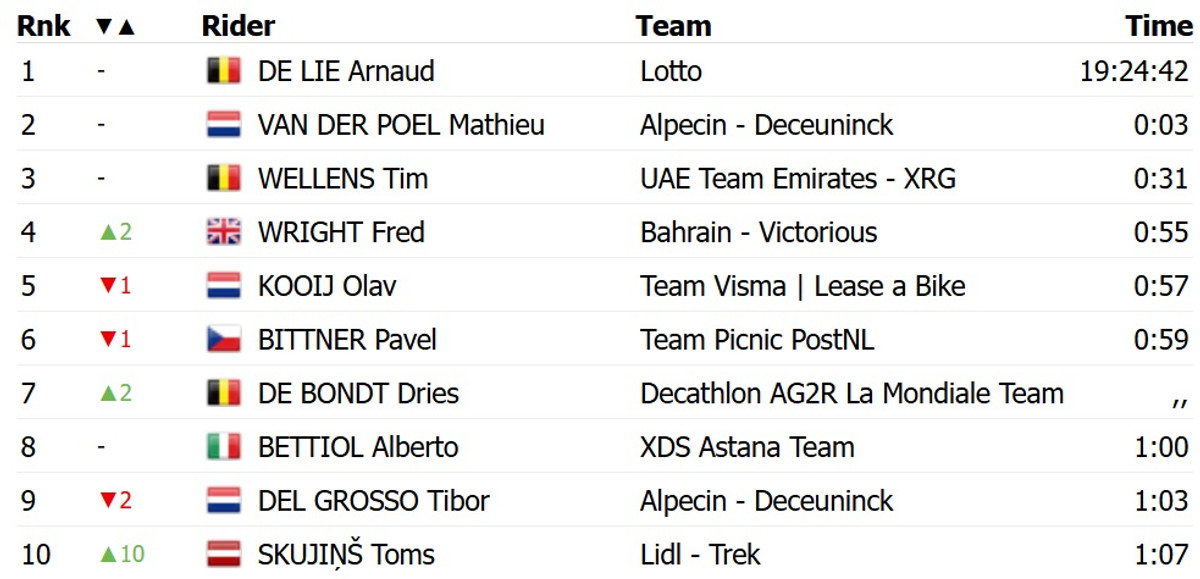 Де Ли выиграл заключительный этап, опередив в финишном спринте из пелотона нидерландца Матье Ван дер Пула из команды Alpecin Deceuninck и бельгийца Дриса Де Бондта из Decathlon Ag2r. В общем зачете Де Ли на 3 секунды опередил того же Ван дер Пула, топ-3 с отставанием в 31 секунду замкнул бельгиец Тим Велленс из UAE Emirates.