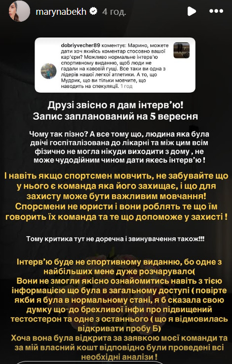 "Вони не змогли якісно ознайомитись навіть з тією інформацією, що була в загальному доступі. Повірте, якби я була в нормальному стані, я б сказала свою думку щодо брехливої інфи про підвищений тестостерон та одне з останнього (що я відмовилась відкривати пробу Б). Хоча вона була відкрита за заявкою моєї команди та за мій власний кошт відповідно були проведені всі необхідні аналізи", – йдеться в повідомленні.