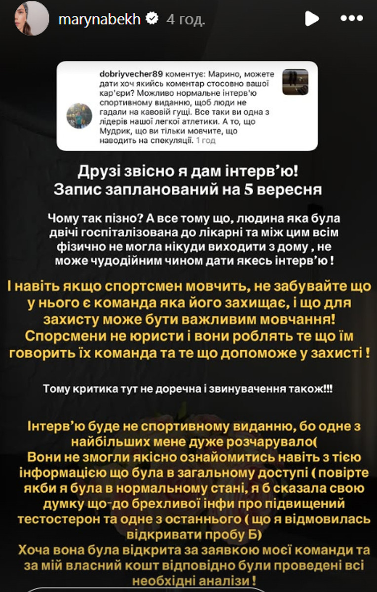 Бех-Романчук анонсувала інтерв'ю та заперечила чутки про підвищений тестостерон та пробу Б