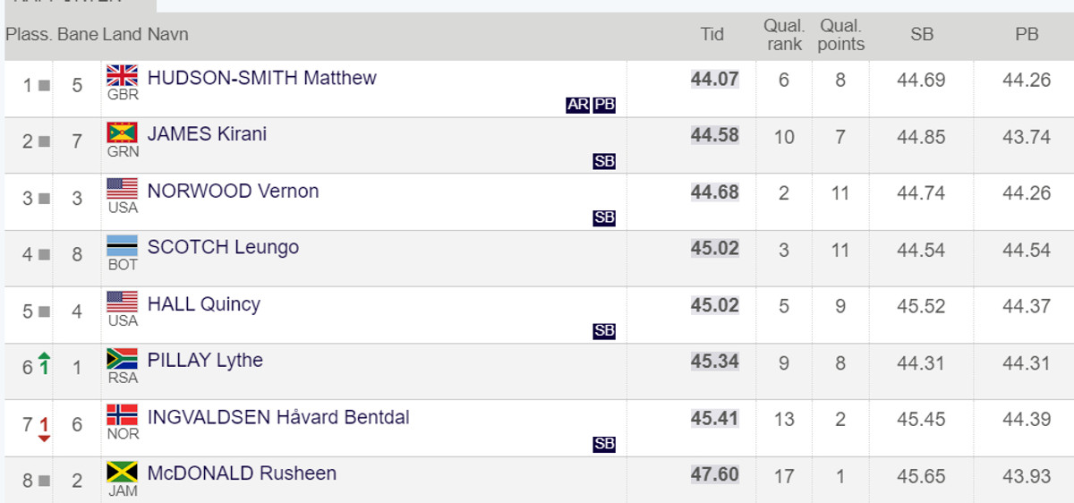 Гадсон-Сміт подолав дистанцію за 44,07, що стало новим європейським рекордом. Другим фінішував Кірані Джеймса з Ямайки (44,58), третім — американець Вернон Норвуд (44,68).