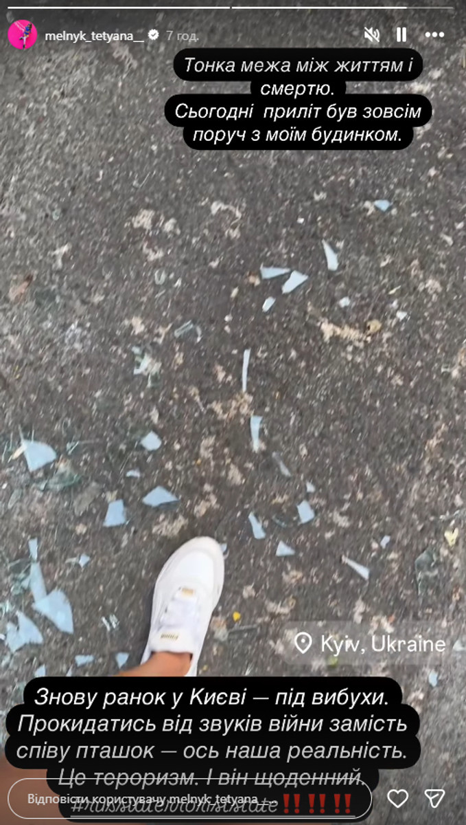 Знову ранок у Києві – під вибухи. Прокидатися від звуків війни замість співу птахів – ось наша реальність. Це тероризм, і він щоденний", – розповіла Мельник.