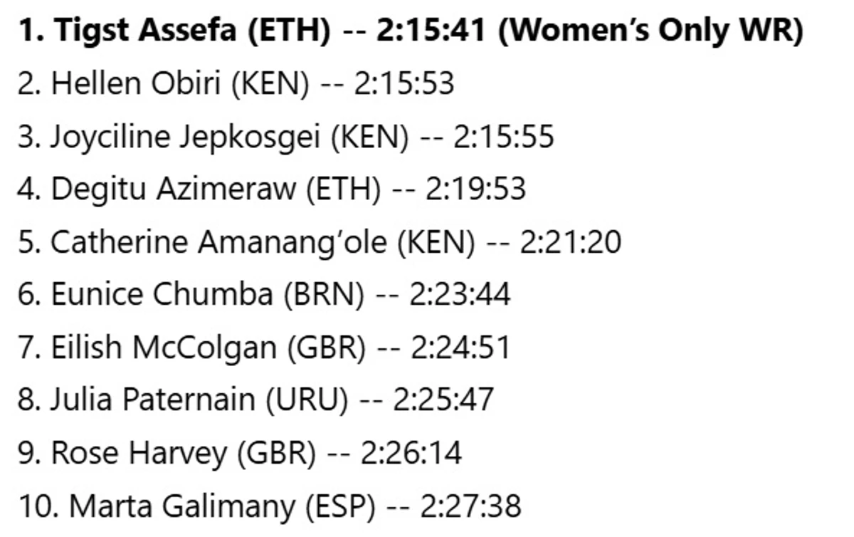 Новий рекорд був встановлений і в жіночому марафоні: ефіопка Тігст Ассефа перемогла з результатом 2:15:41, покращивши на 9 секунд власний рекорд зразка минулорічного Лондонського марафону.