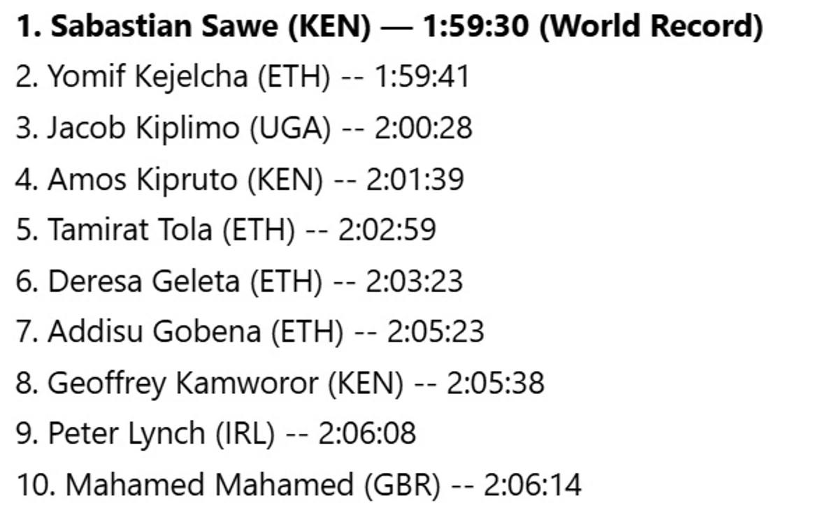 Друге місце посів ефіоп Йоміф Кеджелча, який також вибіг із двох годин: його результат – 1:59:40. Попередній рекорд марафонський дистанцій належав Келвіну Кіптуму, який в 2023 році пробіг Чиказький марафон за 2:00:35.