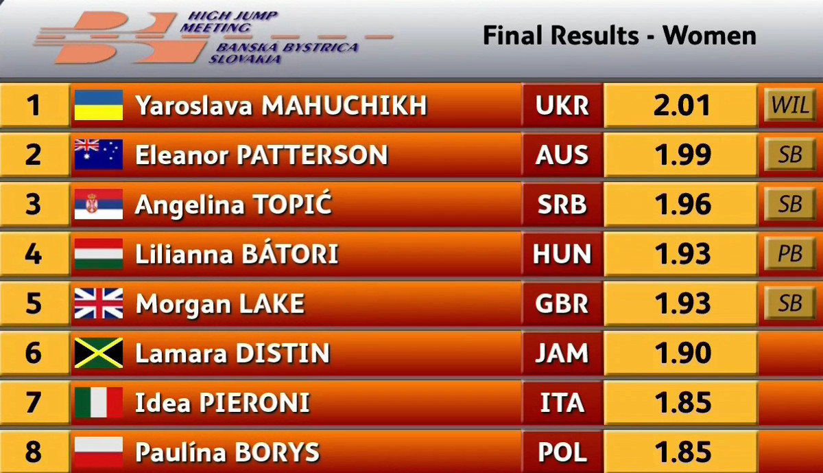 Незважаючи на те, що перемога вже була в кармані, Магучіх вирішила стрибати на 2,04 м, але жодна з трьох спроб не була вдалою.