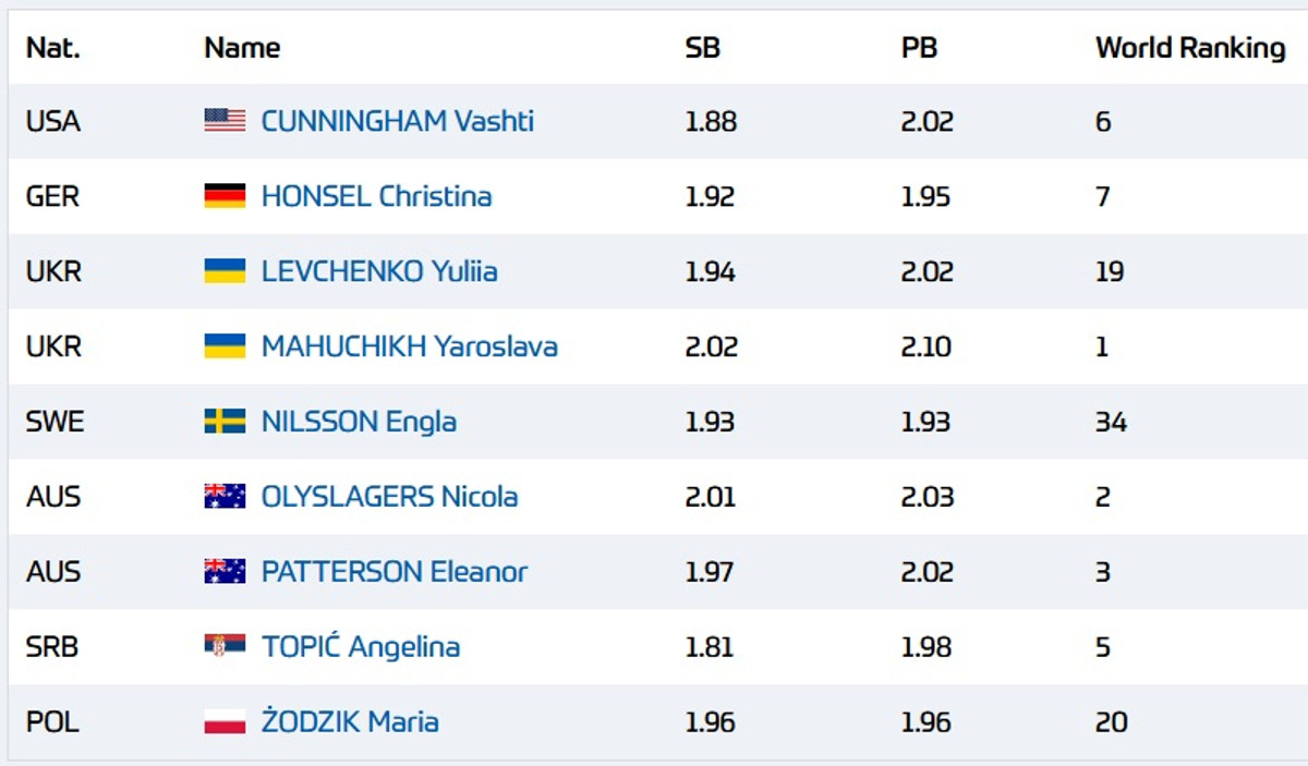 Про це повідомляє пресслужба змагань, яка опублікувала повний склад учасників етапу в жіночих стрибках у висоті.