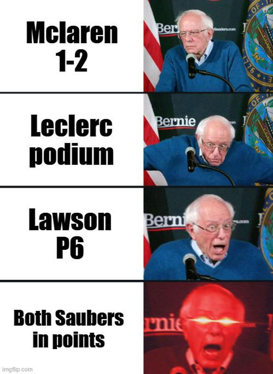 Піастрі перестав відігравати по 0,2 секунди, а навіть навпаки, почав потроху програвати. До того ж, колові (Бортолето з Алонсо) стали свого роду гарантом перемоги Норріса, адже Оскар не зміг їх пройти.