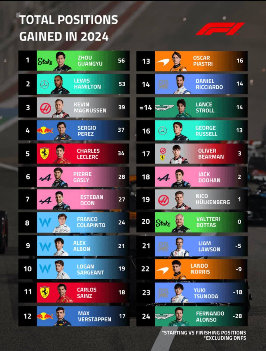 Примітно, що є пілоти, які вийшли в мінус за цим показником, а саме Ліам Лоусон (-5), Ландо Норріс (-9), Юкі Цунода (-18) та Фернандо Алонсо (-28). А також є Валттері Боттас з нулем відіграних/втрачених позицій.