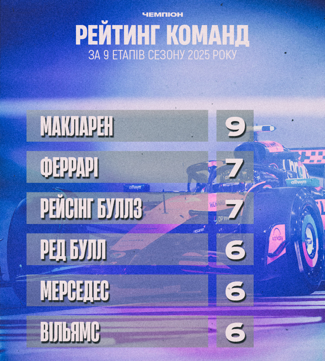Макларен – 9. Усе просто, "папая" наразі найкраща команда, якби стратегії були трохи вдалішими, а командний місток трохи впевненішим, то питання щодо чемпіона світу-2025 було б лише одне – який гонщик з Макларен забере титул.