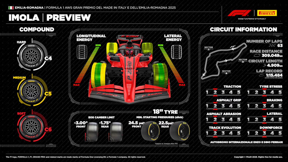 Pirelli вже третій етап поспіль намагається пом'якшувати гуму і ось на Гран-прі Емілії-Романьї на нас очікує найм'якший з усіх можливих конфігурацій вибір шин – C4, C5, C6.
