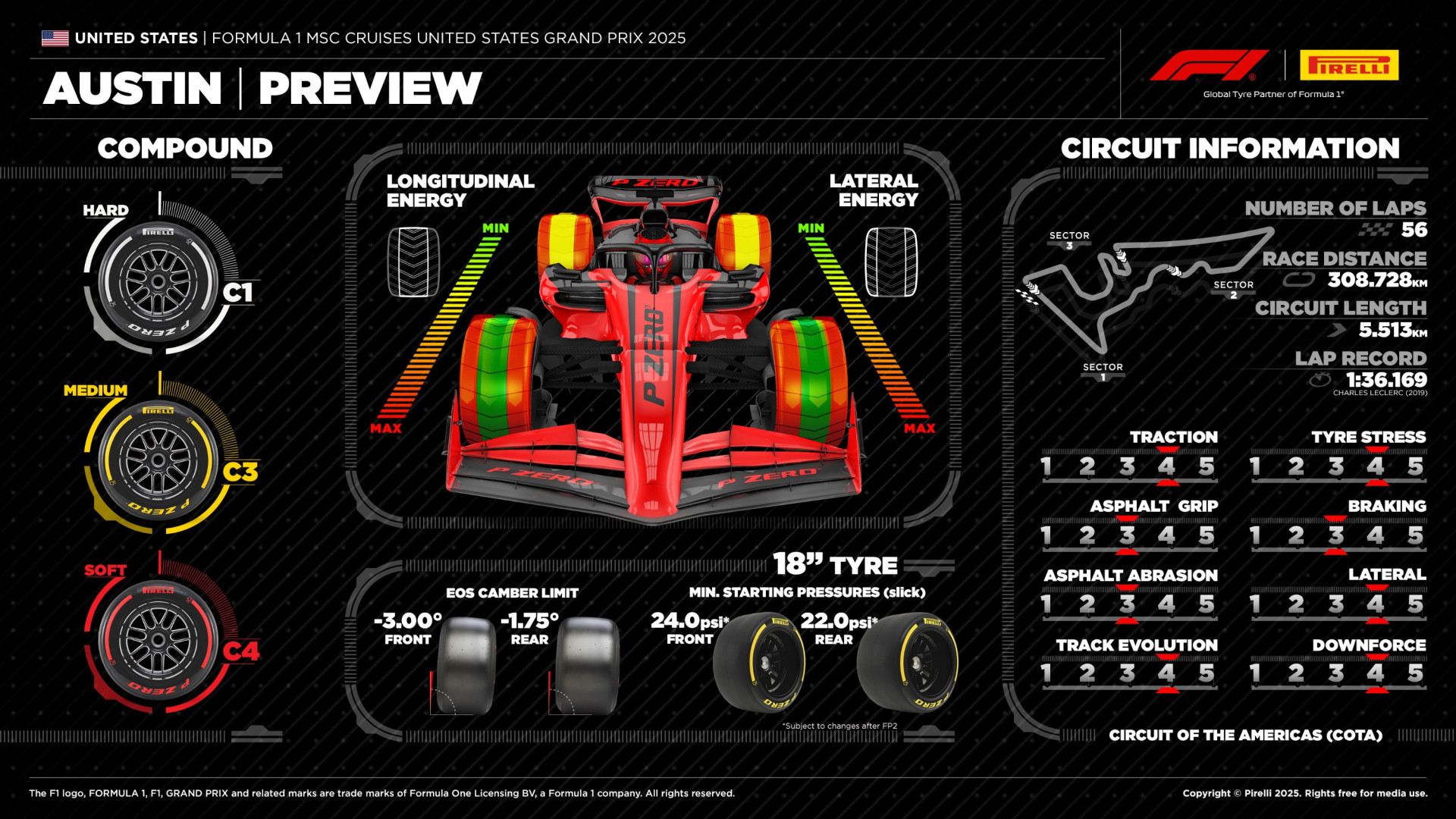У Бельгії через погану погоду не вдалося з'ясувати, як цей вибір міг вплинути на стратегію, тому гонка в COTA може стати першим реальним випробуванням цього вибору, який передбачає використання більш жорсткої гуми Hard, ніж торік на американській трасі, тоді як Medium і Soft залишилися без змін.