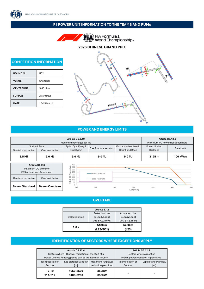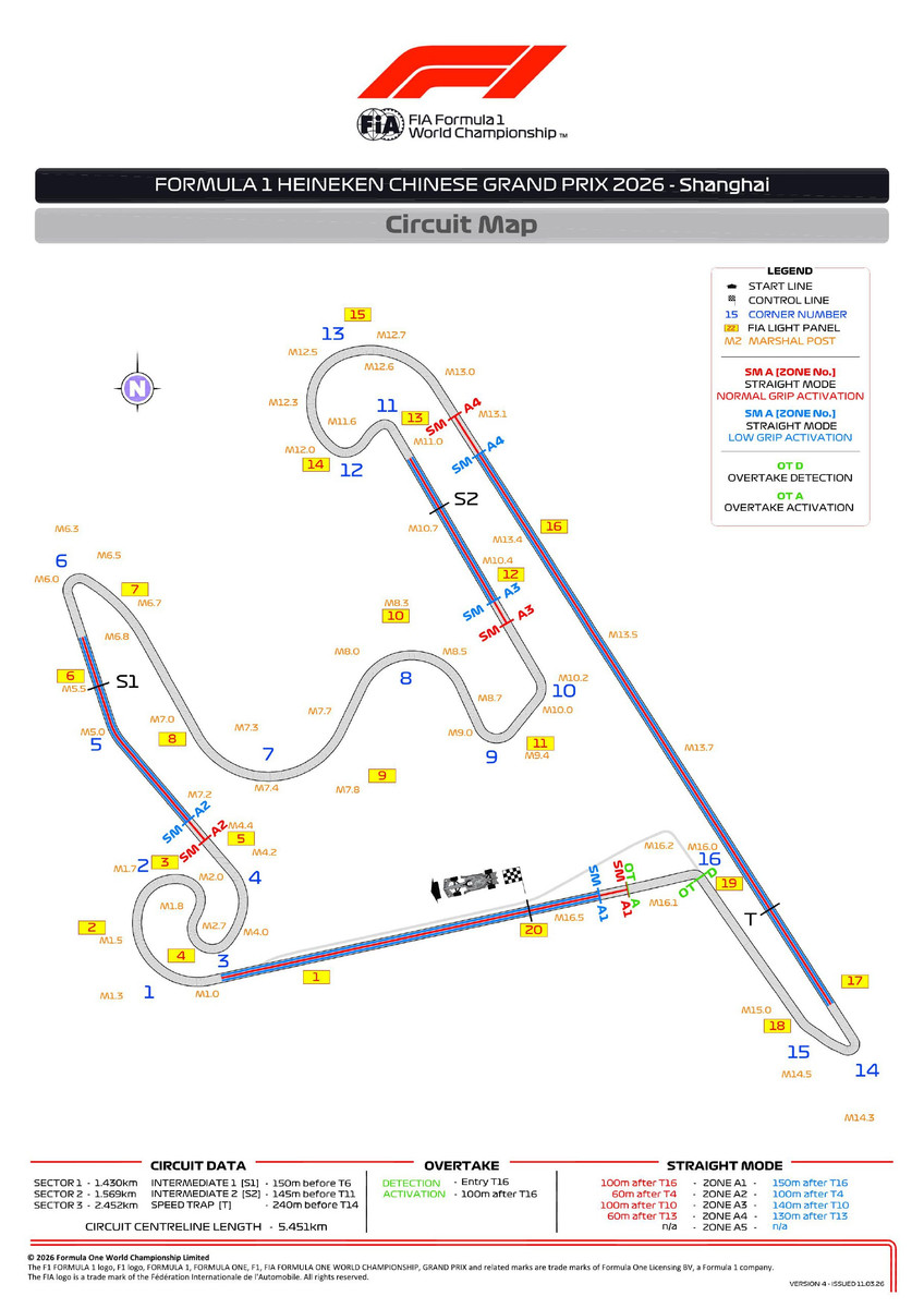 Як ми вже й казали, сезон-2026 приніс чимало змін і DRS більше не використовується, а замість нього працює система активної аеродинаміки. На шанхайській трасі передбачено чотири зони Straight Mode (режим для прямих), де крила переходять у режим зменшеного опору повітря. Вони розташовані – на старт-фінішній прямій між 16 і 1 поворотами, на відрізку 4-6 поворотів, між 10 і 11 поворотами, на довгій прямій 13-14.