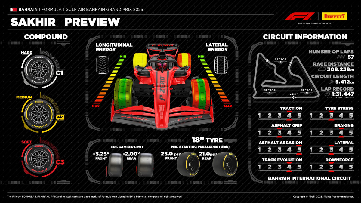 "Як і в Сузуці, команди матимуть вибір між трьома найжорсткішими гумовими сумішами з асортименту Pirelli 2025 року, а саме: C1 - Hard, C2 - Medium та C3 - Soft. Однак, характеристики траси в Сахірі та, власне, температура вимагатимуть іншого підходу, ніж той, що був прийнятий минулого тижня в Японії", – йдеться у заяві.