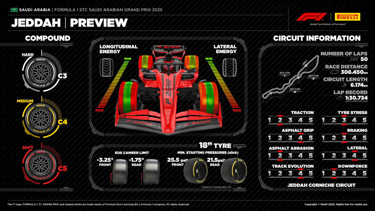 Pirelli вирішили здивувати та вперше в цьому сезоні змінили конфігурацію гуми, у порівнянні з попереднім сезоном. Якщо перших чотирьох гонках ми бачили торішні конфігурації гуми, то на Гран-прі Саудівської Аравії італійці вирішили привезти м'якші шини: C3 - Hard, C4 - Medium та C5 - Soft.