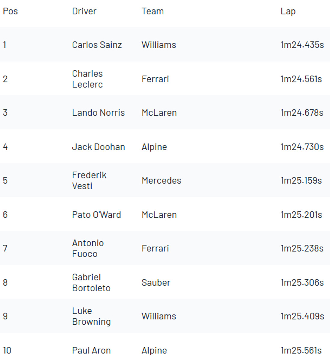 Він проїхав 60 кіл та показав найкращий час (1:24.435). Сайнс випередив свого вже колишнього напарника Шарля Леклера (72 кола) та пілота Макларен Ландо Норріса (78 кіл).