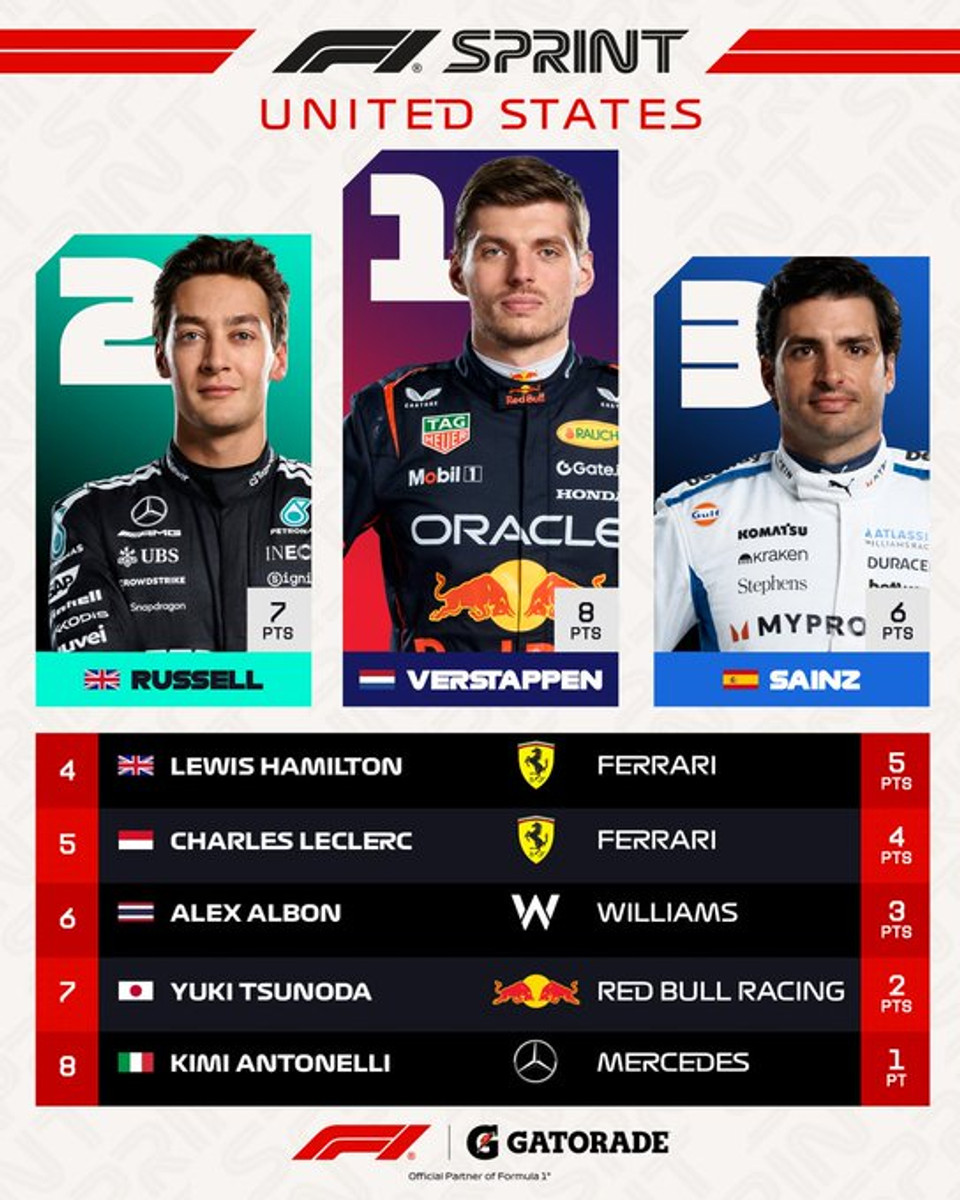 Очки також заробили Александр Албон, Юкі Цунода та Андреа Кімі Антонеллі, який замкнув вісімку за підсумками спринту. Італієць перетнув фінішну лінію 9, проте Олівер Берман, який був перед ним отримав 10-секундний штраф.