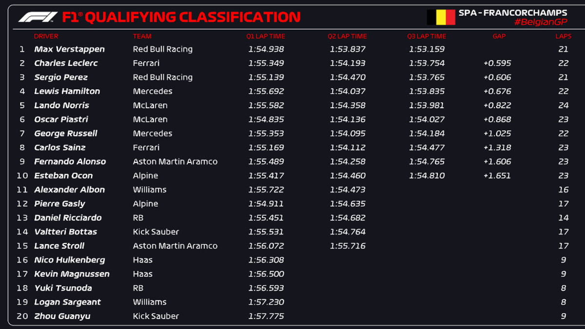 Другим фінішував гонщик Феррарі Шарль Леклер, який фактично займе першу позицію на старті, третім став партнер Макса по команді Серхіо Перес.