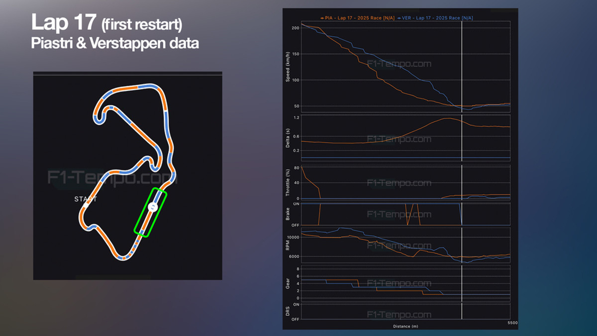На першому рестарті Ферстаппен зміг вчасно загальмувати, щоб не ризикувати і не проскочити повз Піастрі, а на другому – пролетів прямо повз нього.