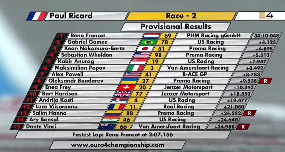 Другу гонку Е4 виграв Рено Франко з команди PHM Racing. Разом із ним на призових місцях опинилися Габріель Гомез (US Racing) та Кін Накамура-Берта (Prema Racing).